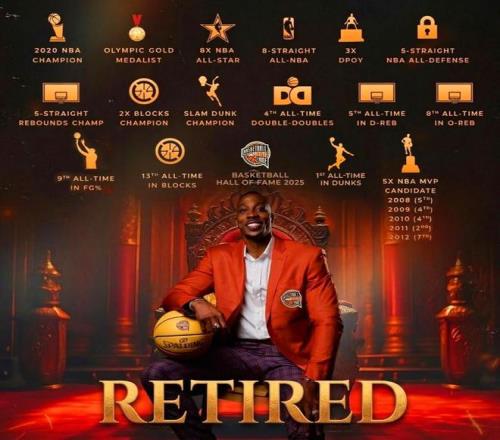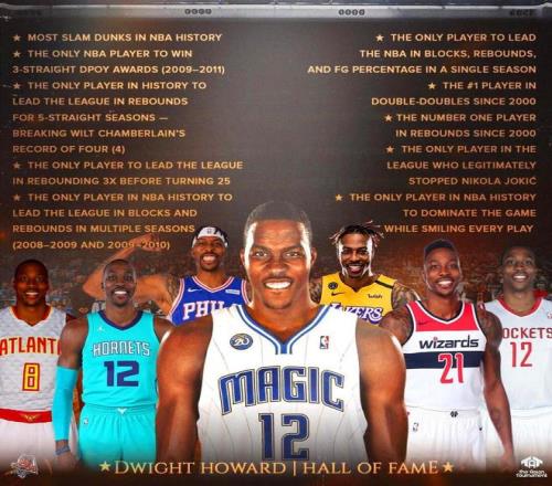 19-20年跟随湖人拿下总冠军、09-11年连续荣膺DPOY、08-12年5次入选一阵、09-12年4次入选防守一阵、07-14年连续8年入选全明星,加上5次拿下篮板王、2次盖帽王、08年奥运金牌,让霍华德在25年成功入选奈史密斯篮球名人堂。