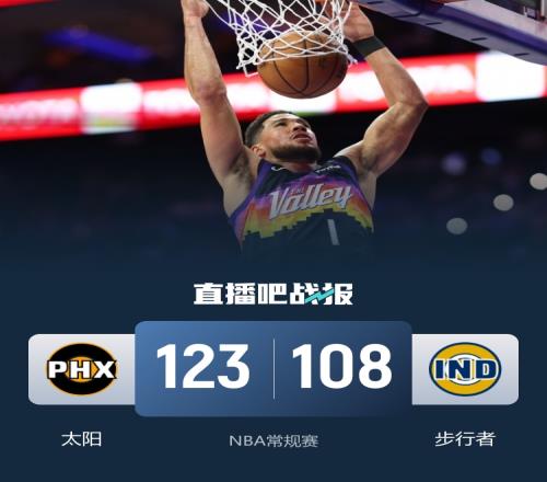 比赛开始,双方开场便陷入缠斗,比分交替领先,祖巴茨空接暴扣,布克连投带罚给出回应,两队大打对攻,马卢阿奇连续补篮得手,次节杰伦·格林连续拿分,太阳轰出12-0攻击波确立两位数优势,内姆哈德连中三分止血,半场战罢太阳67-61领先步行者。易边再战,祖巴茨和内姆哈德没有再出战,布克火力全开,里突外投连续拿分帮助球队占据场上主动,杰伦·格林末节续上火力,步行者没能迫近比分。最终,太阳123-108击败步行者,送对手11连败。