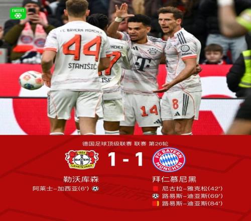北京时间3月14日德国足球顶级联赛第26轮,勒沃库森主场对阵拜仁慕尼黑。上半场,希克助攻加西亚爆射破门,约纳坦-塔被动破门因手球犯规进球无效,雅克松飞铲泰里耶脚踝被直红罚下;下半场,凯恩逼抢门将后破门被判手球犯规进球无效,奥利塞断球助攻迪亚斯推射扳平,迪亚斯被判假摔两黄变一红,霍夫曼破门被判越位进球无效。最终比分勒沃库森 1-1 拜仁。