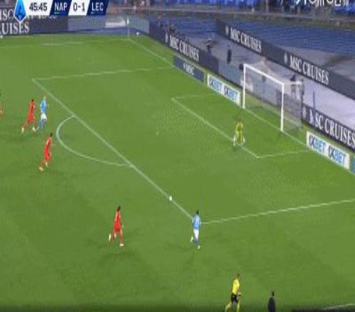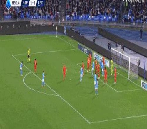 第46分钟,扳平比分,波利塔诺助攻,霍伊伦抢点破门,那不勒斯1-1莱切
