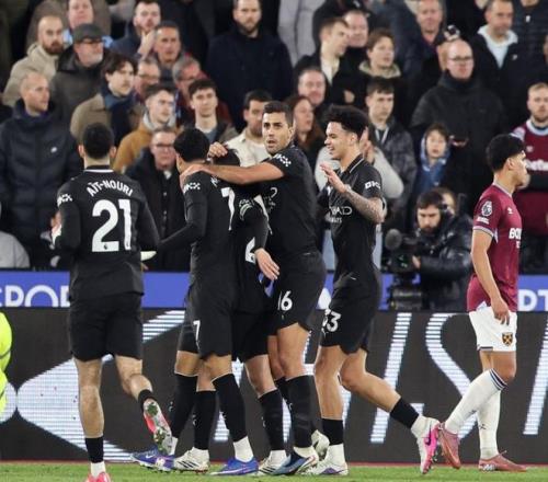 下半场易边再战。第48分钟,马尔穆什在禁区右侧低射远角,踢偏了。第60分钟,瓜迪奥拉进行换人调整,谢尔基和多库替补上场,马尔穆什和努里被换下。紧接着,谢尔基送出直塞球,哈兰德前插,在禁区右侧的射门被扑了出去。第70分钟,哈兰德的射门踢偏了。8分钟后,谢尔基在禁区内的劲射被门将没收。最终,曼城1-1西汉姆联。这样的结果让瓜迪奥拉不敢相信。曼城落后阿森纳9分,争冠希望近乎破灭。英超冠军几乎失去悬念。