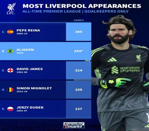体育播报3月15日宣 阿利松与利物浦正式完成续约,德转也盘点了利物浦队史门将球员在英超出场次数榜,具体如下: