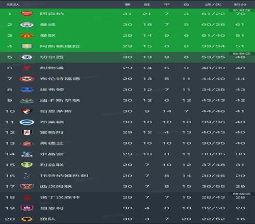 英超最新积分榜