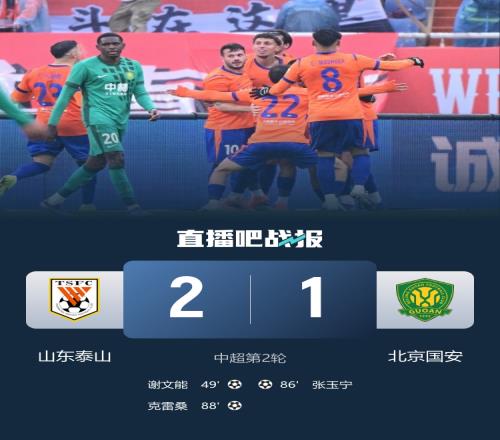 体育播报3月14日宣 北京时间3月14日下午15时30分,2026赛季中超第2轮在济南奥体中心体育场展开角逐,山东泰山主场迎战北京国安。上半场克雷桑、李源一、拉莫斯染黄,下半场谢文能打破僵局,张玉宁扳平,恩科洛洛助攻,克雷桑传射助泰山领先。最终山东泰山主场2-1战胜北京国安,泰山取得两连胜积分归零暂居第4,国安遭遇首败仍为负2分名列第11,延续10年客场不胜泰山魔咒。