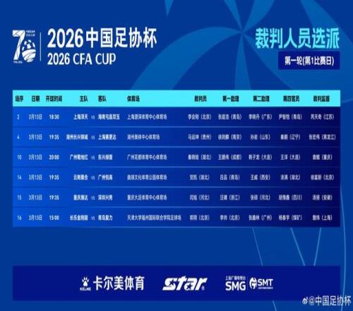 3月13日,2026中国足协杯迎来首轮首个比赛日。赛前,中国足协发布了首日6场比赛的裁判人员选派安排表。